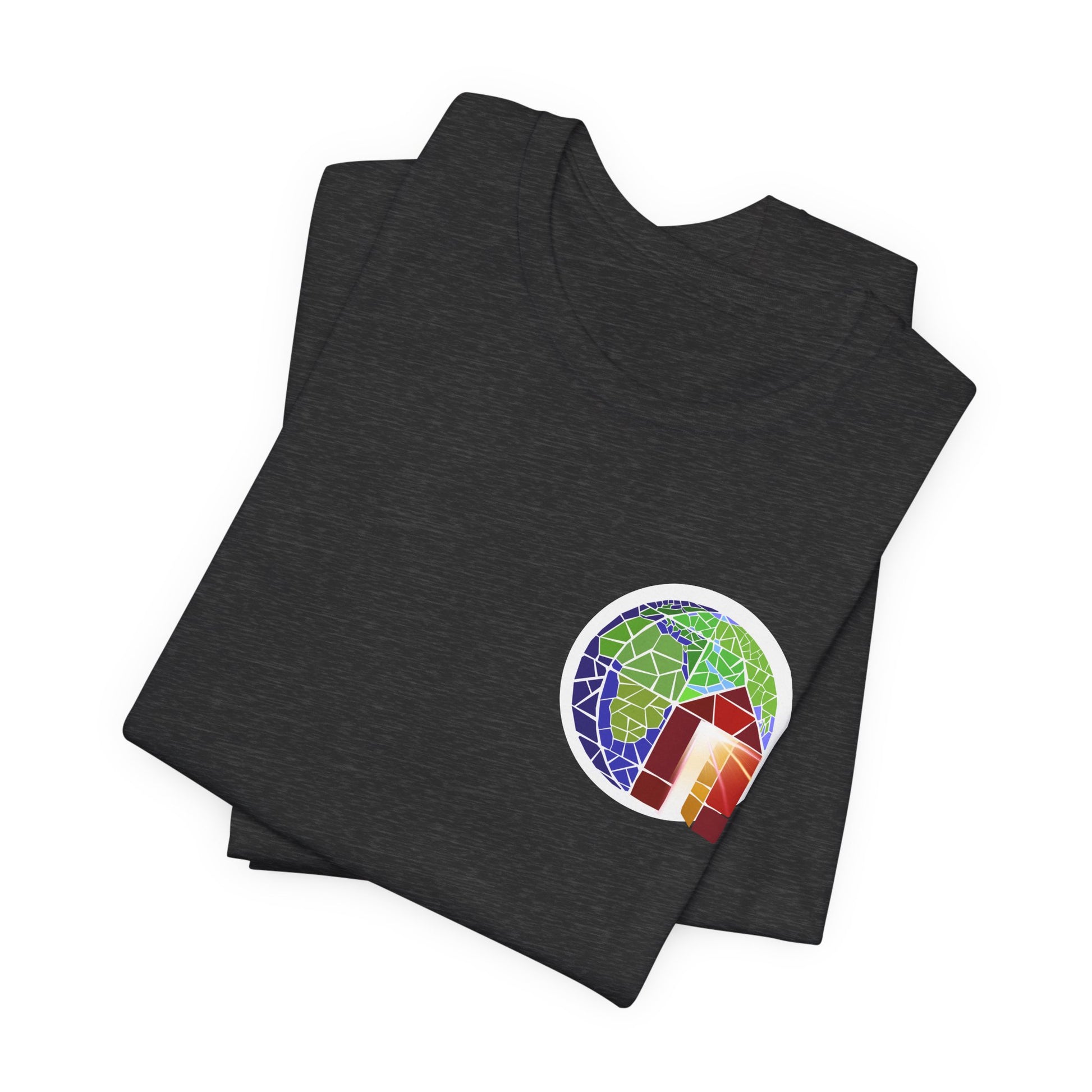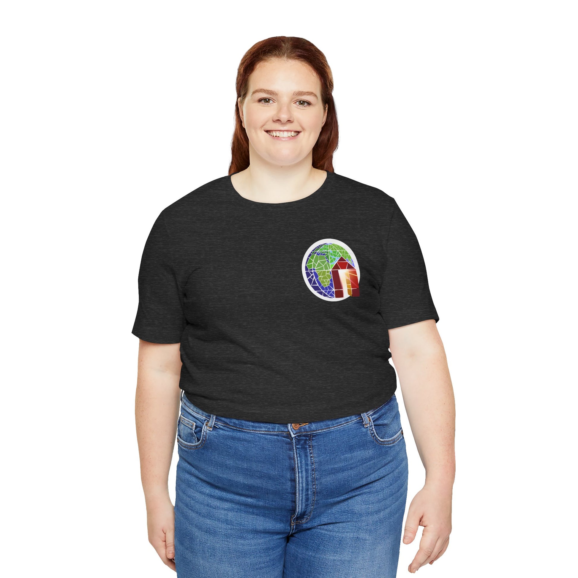 Copy of Large Earth & Cabin Pocket Tee — Small Colorful Globe Cabin Chest Graphic T-Shirt