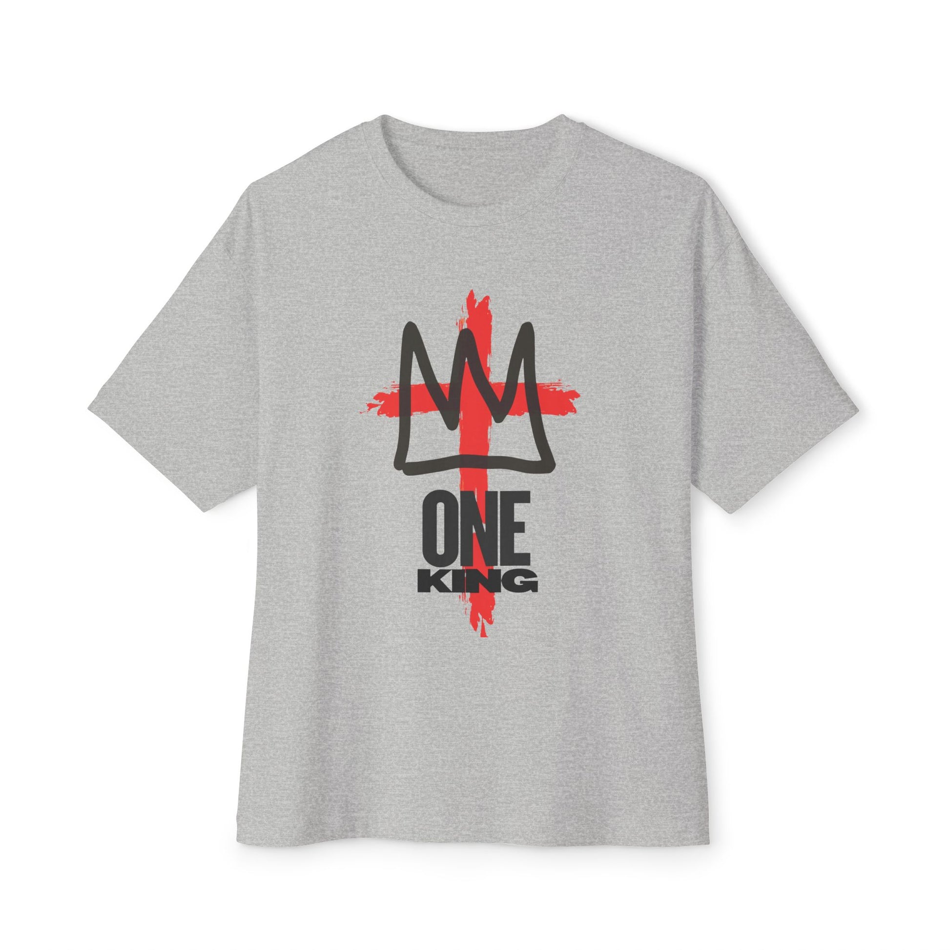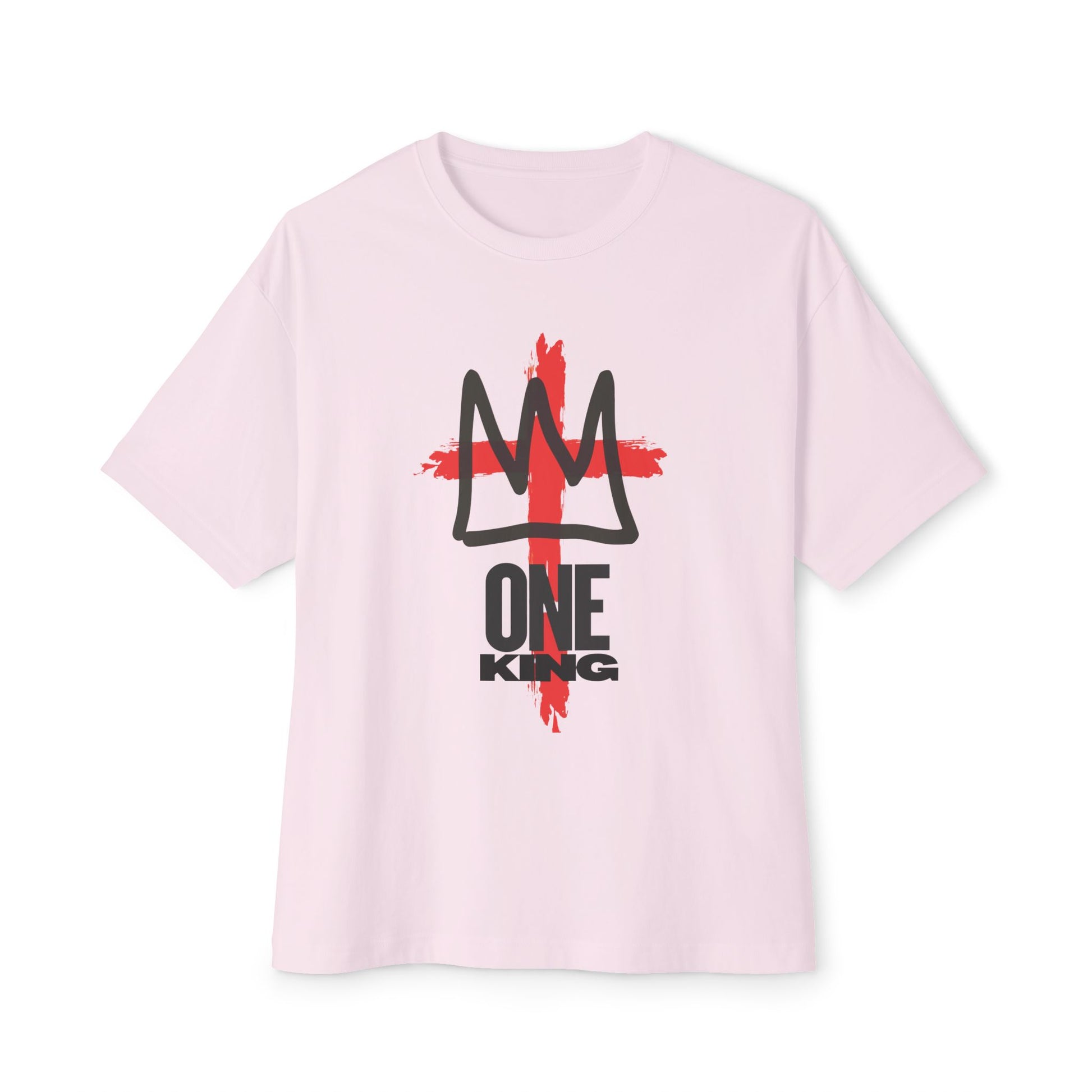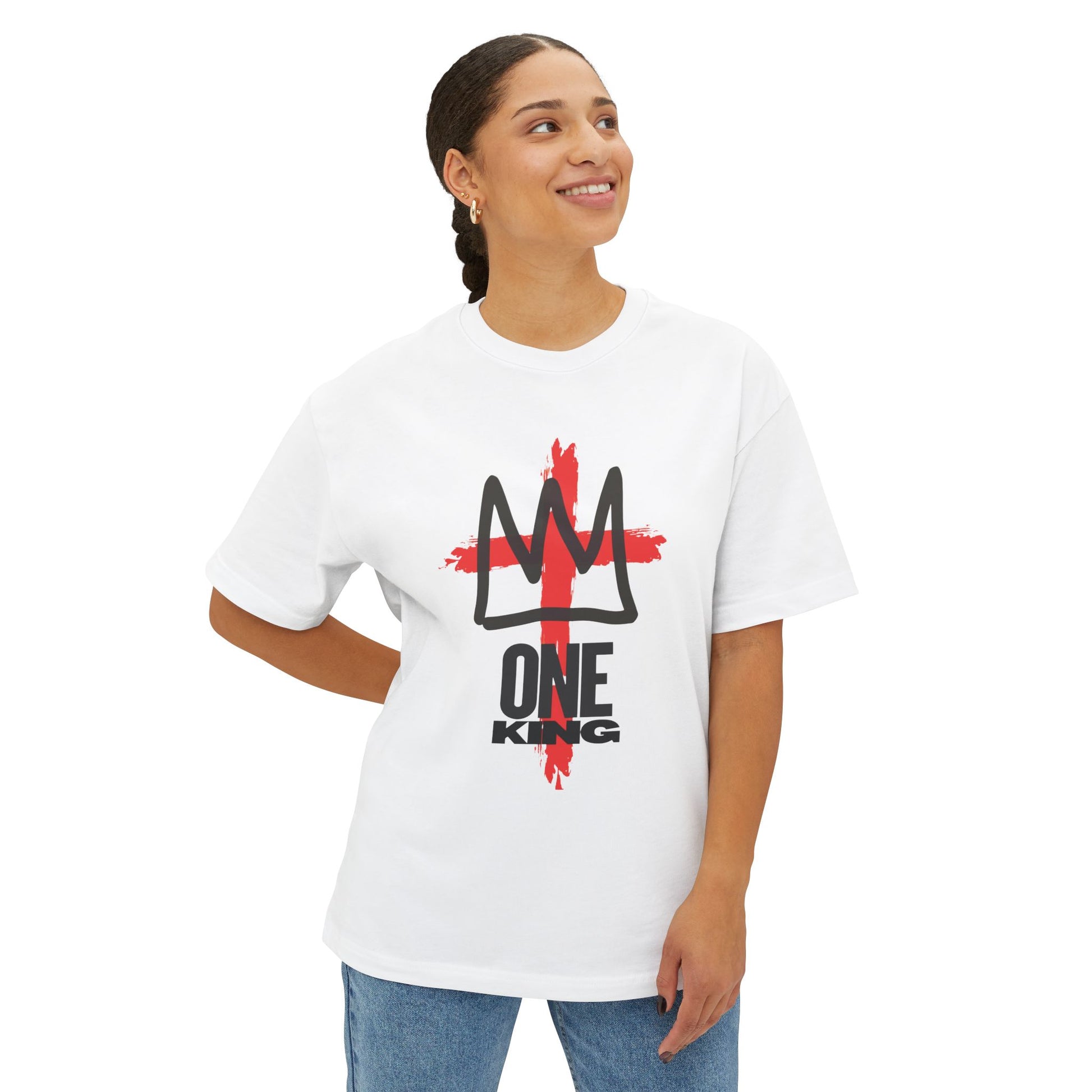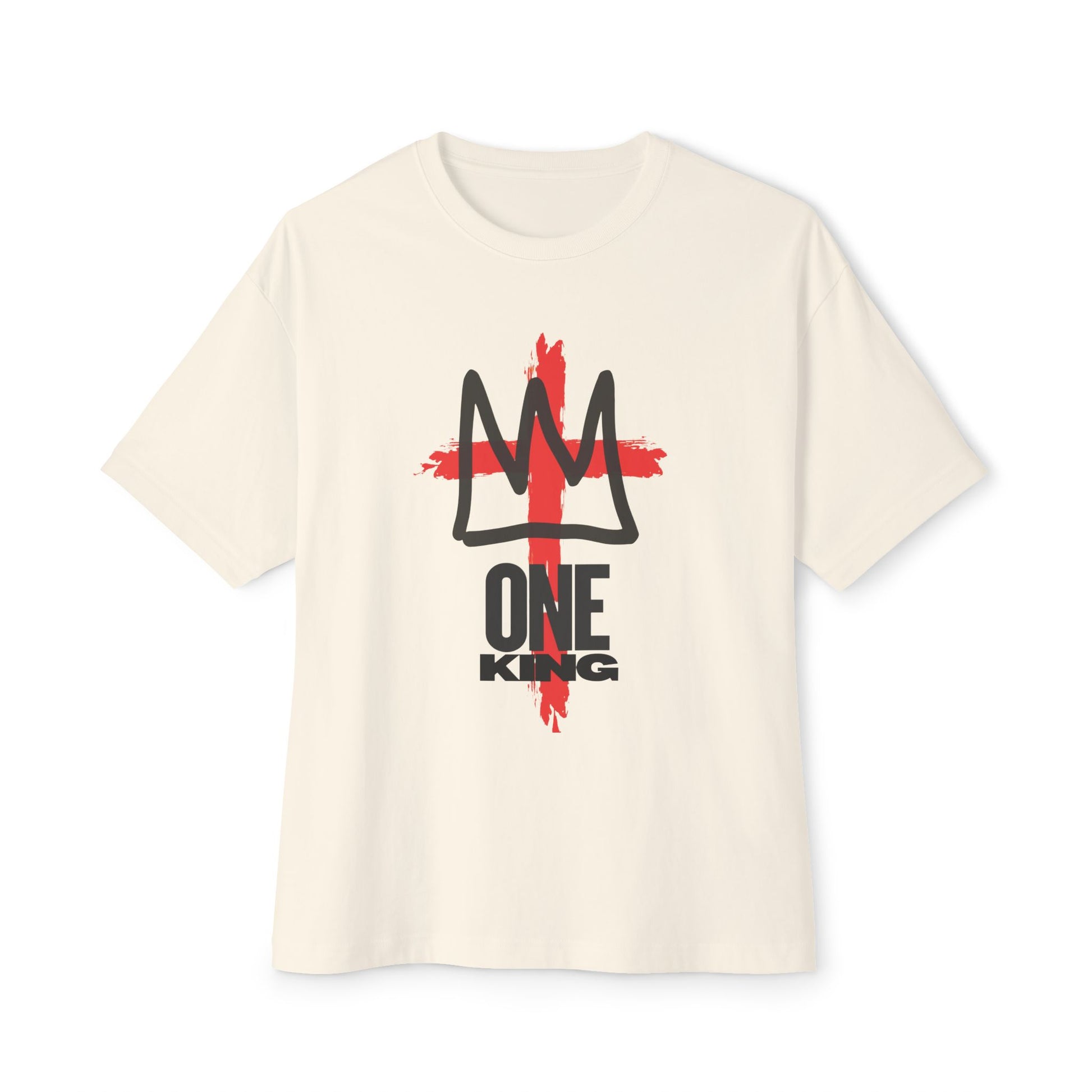 This oversized boxy tee carries quiet confidence and a bold, symbolic graphic: a hand-drawn crown layered over a red brushstroke cross with the words ONE KING beneath. It sits loose and relaxed, the dropped shoulders and medium-weight cotton giving it a lived-in drape that moves with you. Wear it for slow Sundays, street-side coffee runs, or community gatherings where the message matters more than the label. The design feels both modern and reverent—subtle faith-forward imagery without shouting—so it slips seamlessly into everyday wardrobes while still making a thoughtful statement.