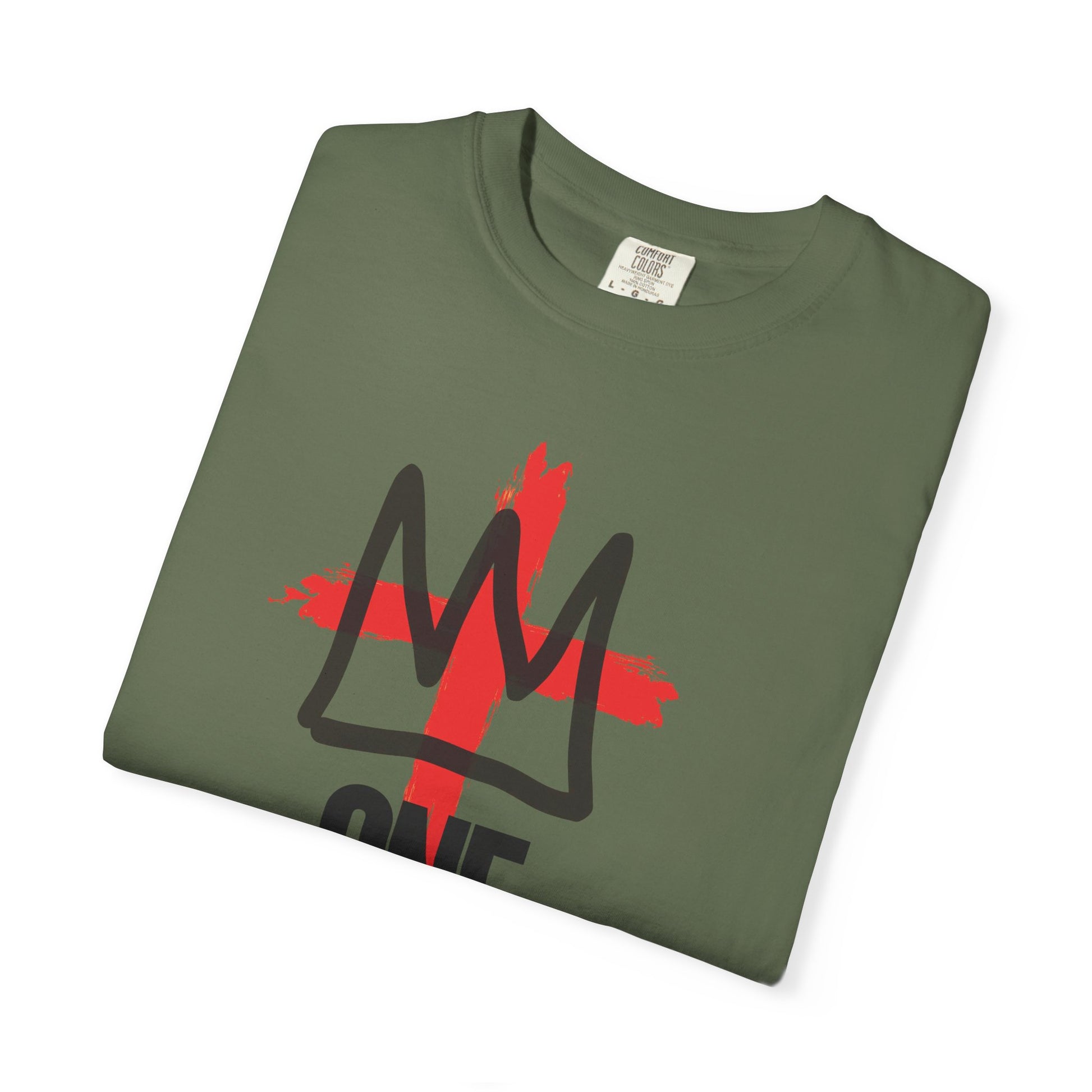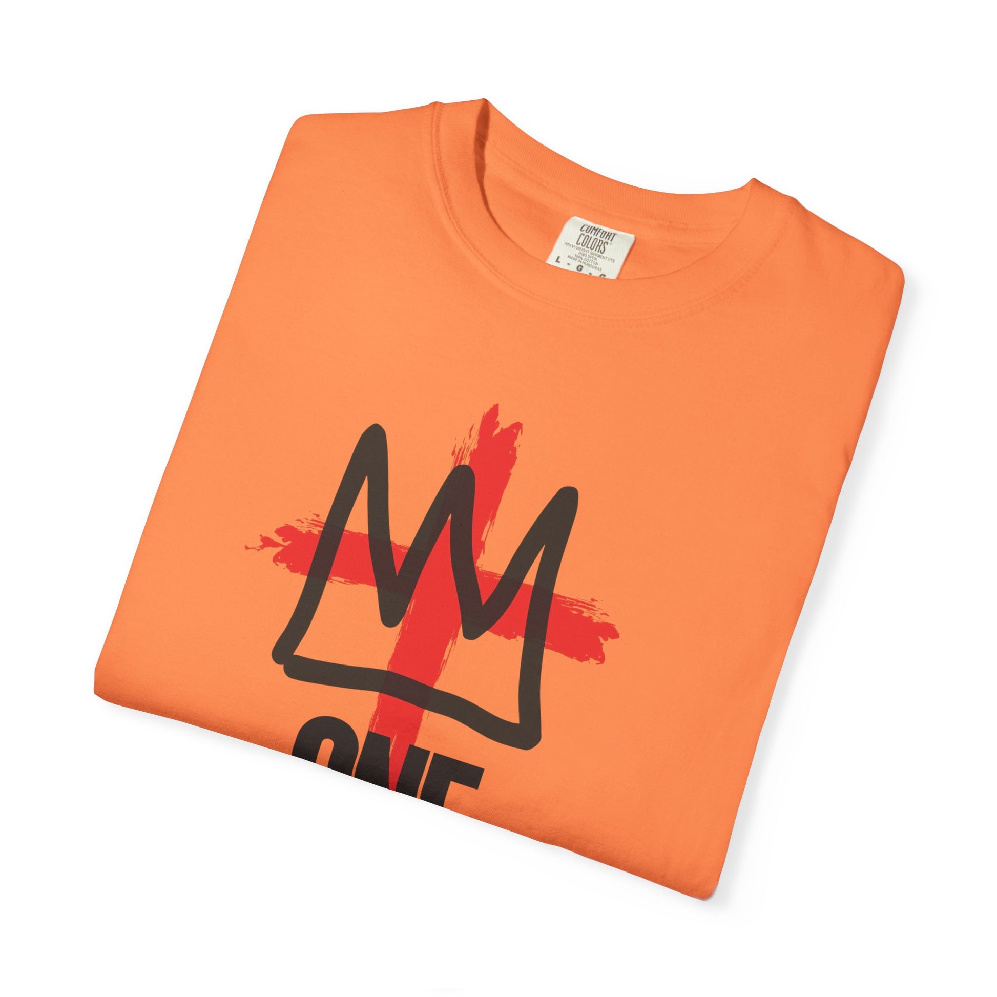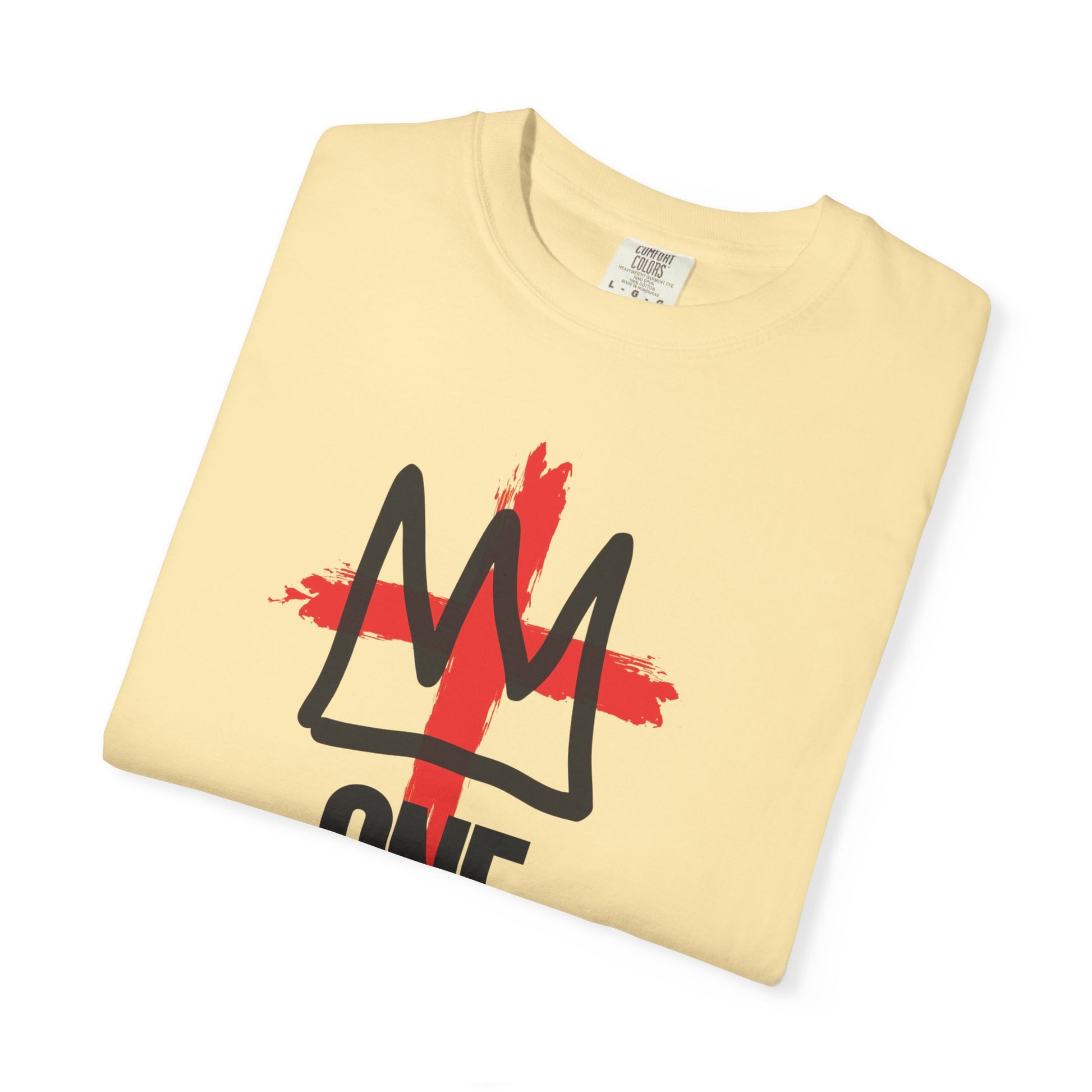 This relaxed, garment-dyed tee blends lived-in softness with a bold, streetwise graphic. The 100% ring-spun cotton feels broken-in from the first wear, while the medium-weight fabric gives it structure without stiffness. A hand-painted red cross sits behind a rough, crown-like mark and the stacked “ONE / KING” text, creating a look that reads both spiritual and rebellious. Wear it layered under a jacket or alone on warm days — it moves easily from neighborhood hangouts to weekend markets. The washed color and sewn-in label keep the vibe low-key and authentic, like a favorite tee you’ve owned for years.